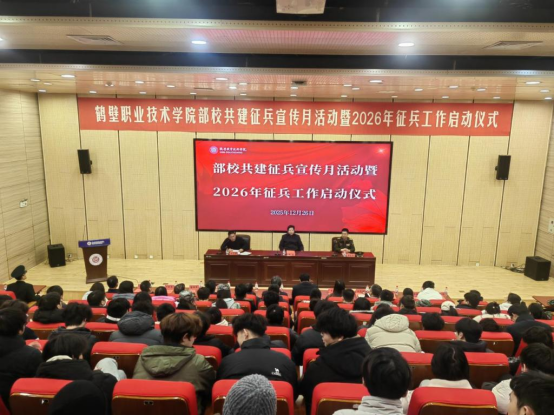 12月26日,我校部校共建征兵宣传月活动暨2026年征兵工作启动仪式在诚信礼堂1号报告厅举行。校党委副书记赵勇、鹤山区人武部政委解晓锋出席仪式。党委委员、副校长杜永庆主持仪式。武装部负责人、各二级学院党总支负责人、辅导员代表、大学生军事协会代表及学生代表200余人参加。
