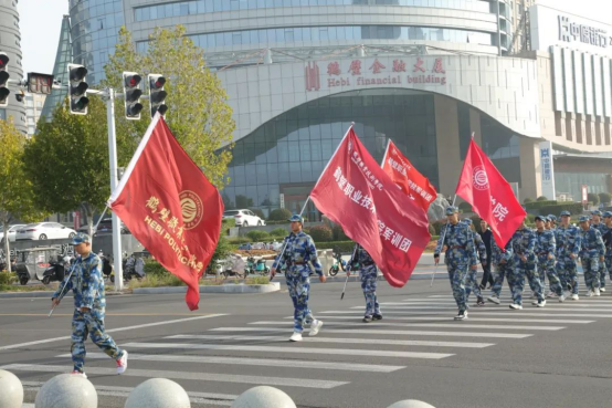 上午8时30分,随着拉练总指挥下达出发命令后,各连队在校旗和军训团团旗的带领下,从海棠园校区南大门广场出发,沿淇河公园步道至朝歌里广场再原路返回,全程15公里。